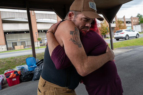 Kelly receives a hug at a small distribution to the homeless and others in need set up by Ashley Edwards, a former addict, in the West Virginian city of Beckley on October 06, 2023 in Beckley, West Virginia. (Photo by Spencer Platt/Getty Images)