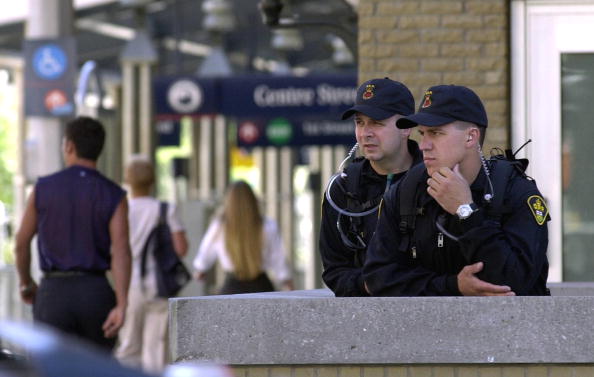 Police keep watch on a street corner near the G8 International Media Center 25 June 2002 in Calgary, Alberta. (Photo by BOB PEARSON/AFP via Getty Images)