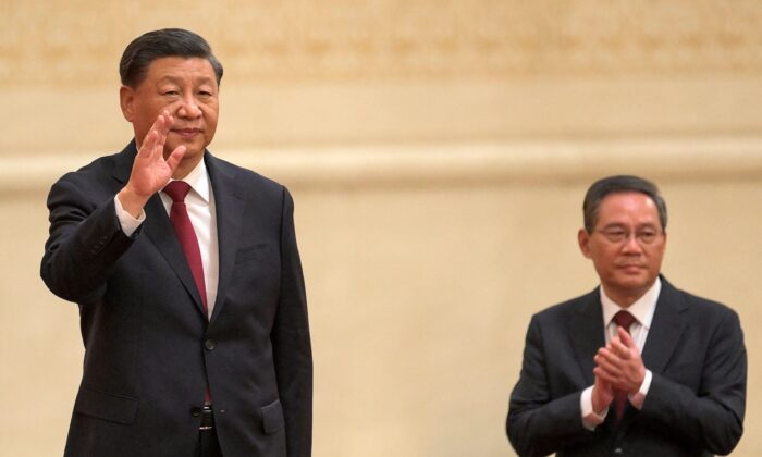 China’s President Xi Jinping (L) waves with Li Qiang, a member of the Chinese Communist Party’s new Politburo Standing Committee, the nation’s top decision-making body, as they meet the media in the Great Hall of the People in Beijing on October 23, 2022. (Photo by WANG ZHAO/AFP via Getty Images)