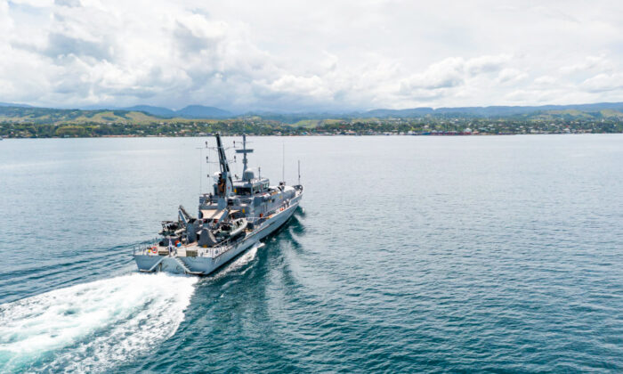 In this handout provided by the Australian Department of Defence, Armadale Class Patrol Boat, HMAS Armidale, sails into the Port of Honiara, Guadalcanal Island, Solomon Islands, on Dec. 1, 2021. (CPL Brodie Cross/Australian Department of Defence via Getty Images)