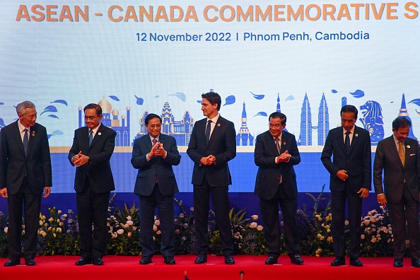 (L-R) Singapore’s President Lee Hsien Loong, Thailand’s Prime Minister Prayut Chan-o-cha, Vietnams Prime Minister Pham Minh Chinh, Canada’s Prime MinisterJustin Trudeau, Cambodia’s Prime Minister Hun Sen, Indonesia’s President Joko Widodo and Brunei’s Sultan Hassanal Bolkiah at the ASEAN-Canada Summit as part of the 40th and 41st Association of Southeast Asian Nations (ASEAN) Summits in Phnom Penh on November 12, 2022. (Photo by Nhac NGUYEN / AFP via Getty Images)