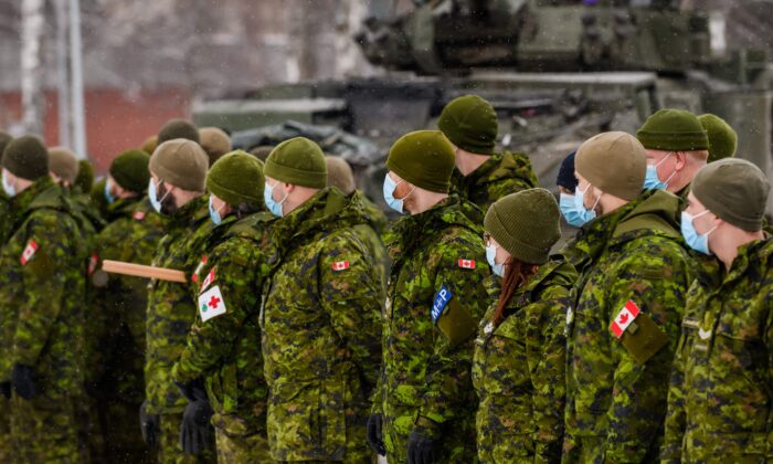 Canadian soldiers wait to meet Minister of Defence Anita Anand in Adazi, Latvia, on Feb. 3, 2022. (Gints Ivuskans/AFP via Getty Images)