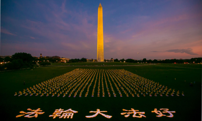 Over a thousand Falun Gong practitioners hold a candlelight vigil at the Washington Monument on July 21, 2022. (Lisa Fan/The Epoch Times)