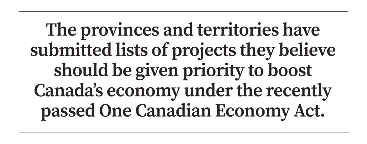 The provinces and territories have submitted lists of projects they believe should be given priority to boost Canada’s economy under the recently passed One Canadian Economy Act that aimed to fast-track the approval of major projects deemed to be in the national interest.