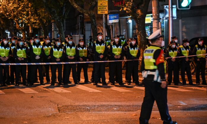 Police block Wulumuqi street, named for Urumqi in Shanghai on Nov. 27, 2022. (Hector Retamal/AFP via Getty Images)