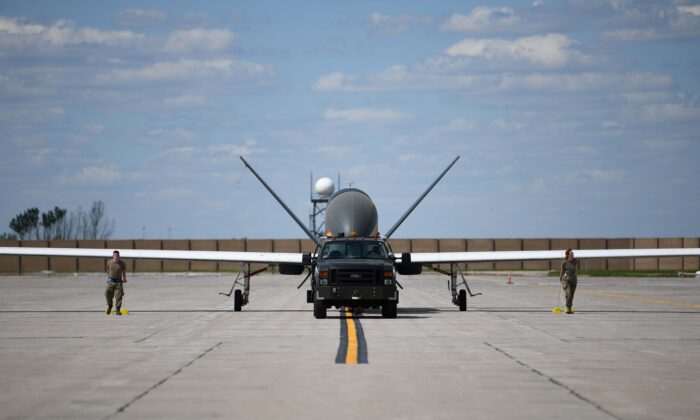 Airmen assigned to the 319th Aircraft Maintenance Squadron from Grand Forks Air Force Base, North Dakota, tow an RQ-4 Block 30 Global Hawk remotely piloted aircraft on June 6, 2022. (U.S. Air Force photo by Senior Airman Ashley Richards)