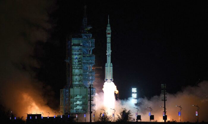 A Long March-2F carrier rocket, carrying the Shenzhou-13 spacecraft with the second crew of three astronauts to China’s new space station, lifts off from the Jiuquan Satellite Launch Centre in the Gobi desert in northwest China early on Oct. 16, 2021. (STR/AFP via Getty Images)