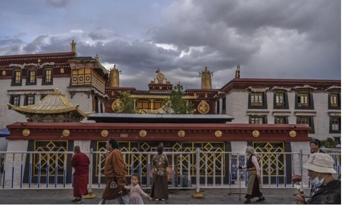 Tibetan Buddhists walk the kora in front of the Jokhang Temple, a UNESCO heritage site, on June 1, 2021 in Lhasa, Tibet region, China. (Kevin Frayer/Getty Images)
