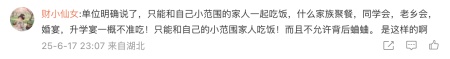 湖北網友:「單位明確說了,只能和自己小范圍的家人一起吃飯,什麼家族聚餐,同學會,老鄉會,婚宴,升學宴一概不准吃!只能和自己的小范圍家人吃飯!而且不允許背後蛐蛐。是這樣的啊。」
