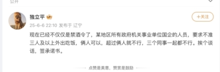 有網友6月7日曾在微博透露,現在中共內部不僅搞禁酒令,某地當局還要求所有政府機關事業單位國企的人員,不准3人以上外出吃飯,即使是同事也不行,「挨個談話,簽承諾書」。