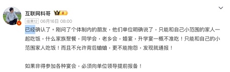 微博大v「網際網絡料哥」6月16日發貼文表示:「已經確認了。剛問了個體制內的朋友,他們單位明確說了,只能和自己小范圍的家人一起吃飯,什麼家族聚餐,同學會,老鄉會,婚宴,升學宴一概不准吃!只能和自己的小范圍家人吃飯!而且不允許背後蛐蛐,更不能抱怨,發現就通報!如果非得參加各種宴會,必須向單位領導提前報備!」