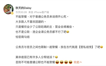 微博大v「秋天的Daisy」評論說:「不能聚餐,對於普通公務員來說得開心死。大多數人不喜歡團建的。只是餐飲業少了公款吃喝的主,營業會艱難些。也不是公款,連企業請公務員都不行了吧。怕官商勾結,公務員與官員之間也限制一起聚餐,放在古代就是『營私結黨』了吧。莫非底層已有許多人分幫結派?否則不可能普通公職也不能聚餐。」