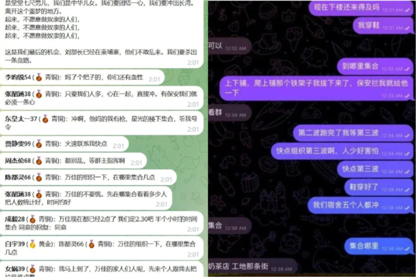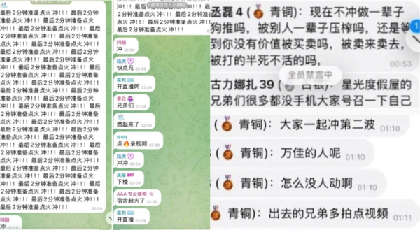 據網傳對話截圖顯示,有組織者發出指示,「最後2分鐘點火,沖」,」宿舍起火了」「快點沖」「大家一起沖第二波」「第二波跑完了,我等第三波」「快點組織第三波」「我們宿舍五個人都沖」。