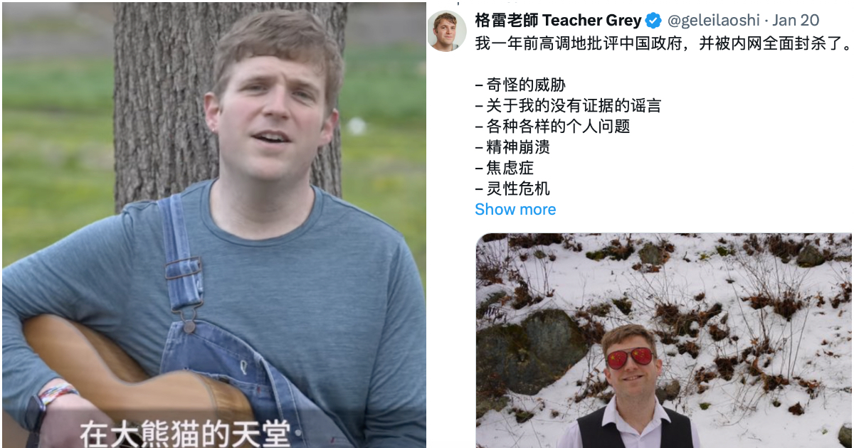 「格雷老師Teacher Grey」畢業於知名的伯克萊音樂學院,擅長演奏烏克麗麗。他在X(前推特)上發布於今年1月的置頂推文寫到,他一年前因為高調地批評中國政府,在中國遭到全面封殺。之後,他經歷了「奇怪的威脅」「關於我的沒有證據的謠言」「各種各樣的個人問題」「精神崩潰」「焦慮症」「靈性危機」。
