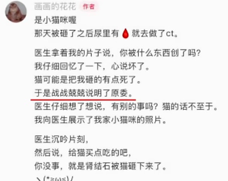 結果醫生笑了,稱讚小貓咪妙手回春,要她給小貓買點好吃的,說小貓把她的腎結石給撞出來了。