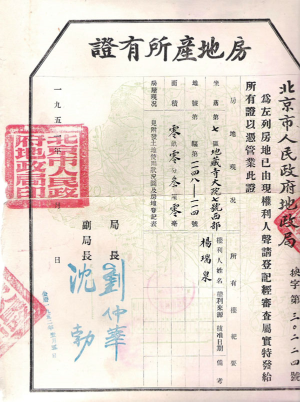 這是一張1952年北京市政府地政局頒發的房地房所有證,房地房位於北京市第七區地藏寺大院七號西部,面積為三厘,房屋現狀見附發土地使用狀況圖及房屋登記表,產權所有人為楊瑞泉。落款蓋有「北京市人民政府地政局印」大方闊邊紅色印鑑,時任局長劉仲華與副局長沈勃的簽字[19]。
