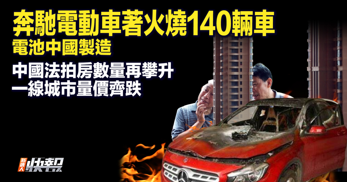 今日焦點:奔馳電動車著火燒140輛車 電池為中國製造;中國法拍房數量再攀升 一線城市量價齊跌;美通脹緩和 消費者購買力增強但關注物價;食品價格過高 香港11萬窮人吃不飽中共戰機向菲巡邏機發射照明彈 菲國外交抗議。