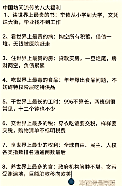 評論訪談 【每日一圖】中國人八大福利 by Editor 4月 24, 2026 4月 24, 2026 註:「每日一圖」來源網絡,或網頁截圖,為紀錄當下中國網民的智慧和幽默。如發現有版權問題,請及時與我們聯繫。 (責任編輯:晟睿) 本文網址: https://www.ntdtv.com/b5/2026/04/23/a104089697.html from NTDTV.com 评论 0 FacebookTwitterLinkedinWhatsappEmail 相關文章 【 每日一圖】顛倒的... 4月 25, 2026 【名家專欄】中共無理... 4月 25, 2026 歷史回音壁:中國媒體... 4月 23, 2026 王赫:中共四新招 公... 4月 23, 2026 千百度:伊朗強硬派占... 4月 23, 2026 袁斌:中共外交部發言... 4月 23, 2026 【每日一圖】當民衆醒... 4月 23, 2026 【名家專欄】伊戰或重... 4月 23, 2026 進化騙局(24) 核... 4月 23, 2026