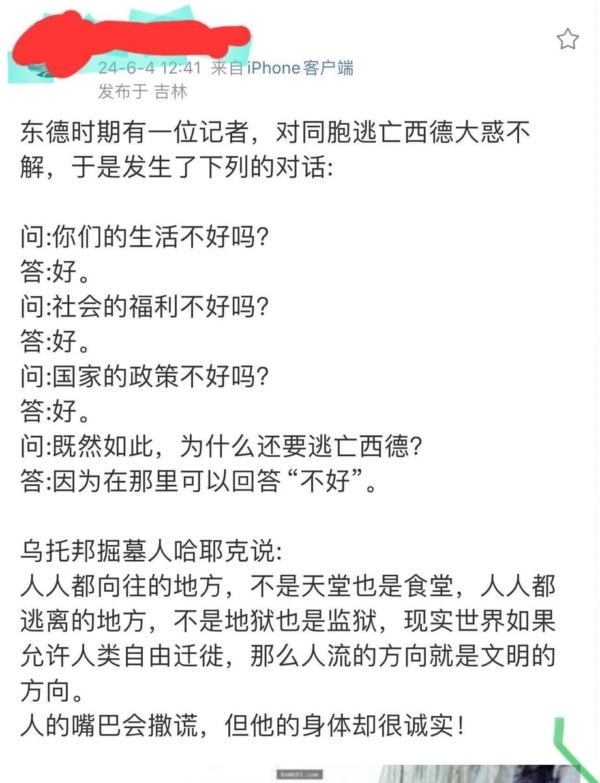 評論訪談 【每日一圖】人的身體卻很誠實 by Editor 6月 8, 2024 6月 8, 2024 註:「每日一圖」來源網絡,或網頁截圖,為紀錄當下中國網民的智慧和幽默。如發現有版權問題,請及時與我們聯繫。 (責任編輯:劉明湘) 本文網址: https://www.ntdtv.com/b5/2024/06/08/a103887923.html from NTDTV.com 评论 0 FacebookTwitterLinkedinWhatsappEmail 相關文章 【每日一圖】「基本盤... 4月 28, 2026 老農問道:「規則」替... 4月 28, 2026 李平:封鎖伊朗是手段... 4月 28, 2026 何艾珊:我所親歷的「... 4月 28, 2026 何艾珊:我所親歷的「... 4月 28, 2026 【每日一圖】求生的表... 4月 27, 2026 【名家專欄】中共種種... 4月 26, 2026 沈舟:美軍掐住中伊海... 4月 26, 2026 吳英年:紀念法輪功四... 4月 26, 2026