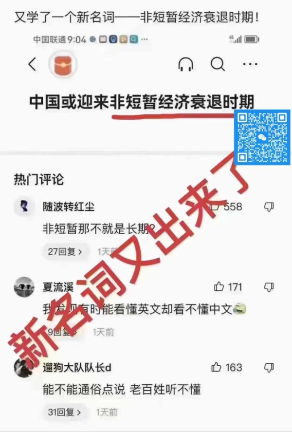 評論訪談 【每日一圖】又造新詞 by Editor 1月 4, 2025 1月 4, 2025 註:「每日一圖」來源網絡,或網頁截圖,為紀錄當下中國網民的智慧和幽默。如發現有版權問題,請及時與我們聯繫。 (責任編輯:劉明湘) 本文網址: https://www.ntdtv.com/b5/2024/12/23/a103940491.html from NTDTV.com 评论 0 FacebookTwitterLinkedinWhatsappEmail 相關文章 周曉輝:美軍開火攔截... 4月 21, 2026 【每日一圖】童話 V... 4月 20, 2026 王赫:擋不住的美中脫... 4月 20, 2026 王友群:中國學生家長... 4月 20, 2026 中共罪行錄:「六... 4月 20, 2026 【傑森口譯】托馬斯大... 4月 19, 2026 【傑森視角】拿捏習近... 4月 19, 2026 中共罪行錄:「挖」和... 4月 19, 2026 沈舟:美軍海上封鎖碾... 4月 19, 2026