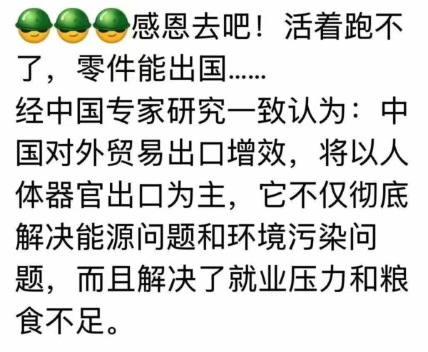評論訪談 【每日一圖】器官出口 by Editor 8月 3, 2025 8月 3, 2025 註:「每日一圖」來源網絡,或網頁截圖,為紀錄當下中國網民的智慧和幽默。如發現有版權問題,請及時與我們聯繫。 (責任編輯:劉明湘) 本文網址: https://www.ntdtv.com/b5/2025/07/23/a104005598.html from NTDTV.com 评论 0 FacebookTwitterLinkedinWhatsappEmail 相關文章 潘石屹《我的反思》背... 4月 17, 2026 【每日一圖】艾滋防活... 4月 17, 2026 韋拓:中共第五縱隊損... 4月 17, 2026 王赫:中共四措施洩其... 4月 17, 2026 夏林:美伊戰爭 仁義... 4月 16, 2026 【 每日一圖】世界公... 4月 16, 2026 【每日一圖】世間最惡 4月 15, 2026 中共罪行錄:因胡風案... 4月 15, 2026 2026年第一季度三... 4月 14, 2026
