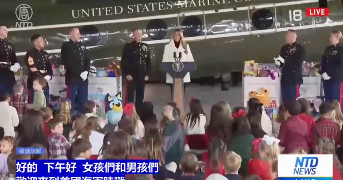 【新唐人北京時間2025年12月09日訊】美東12月8日,美國第一夫人梅蘭妮亞·川普在海軍陸戰隊基地參與「玩具為小孩」慈善活動上發表講話。新唐人、大紀元進行網絡直播,中文即時翻譯字幕。