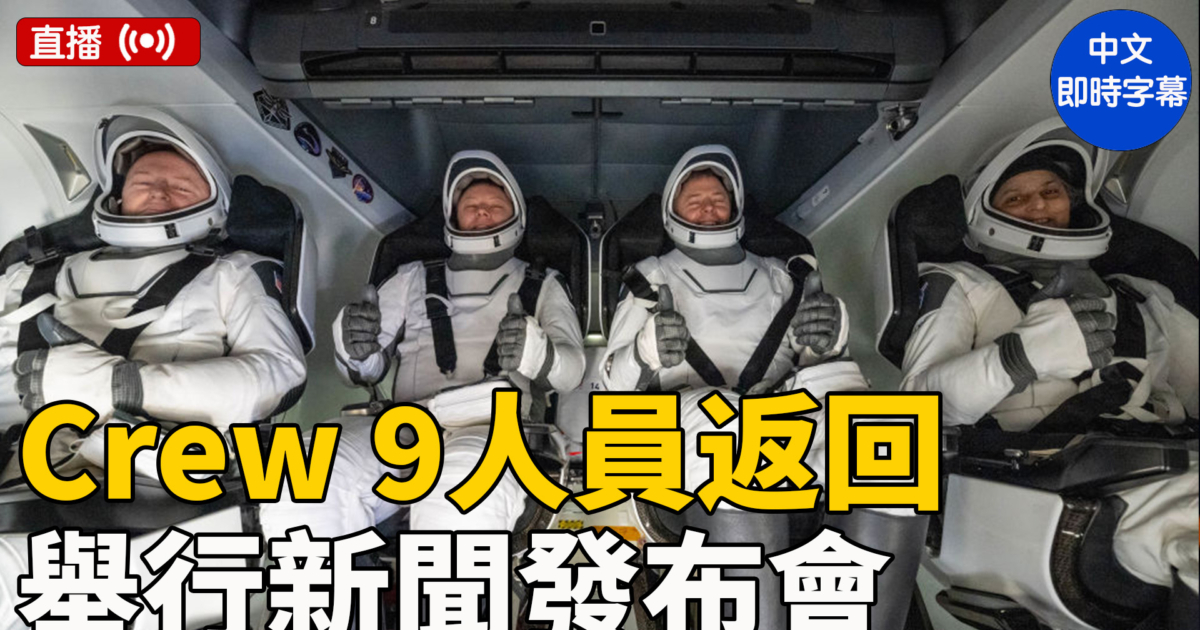 【新唐人北京時間2025年04月01日訊】美東3月31日下午,美國國家航空暨太空總署 (NASA) 的SpaceX Crew 9 太空人尼克·海格(Nick Hague)、蘇尼·威廉斯(Suni Williams) 和 布奇·威爾莫爾(Butch Wilmore)將舉行新聞發布會,新唐人、大紀元進行網絡直播(即時翻譯字幕)。 此前3月18日,上述三人與俄羅斯太空總署太空人亞歷山大·戈爾布諾夫(Aleksandr Gorbunov)乘坐SpaceX「龍」飛船「載人9號」(Crew-9)成功返回地球。其中,蘇尼‧威廉姆斯和布奇‧威爾莫爾滯留在國際太空站長達286天,而戈爾布諾夫由於行程安排將不會參加記者會。