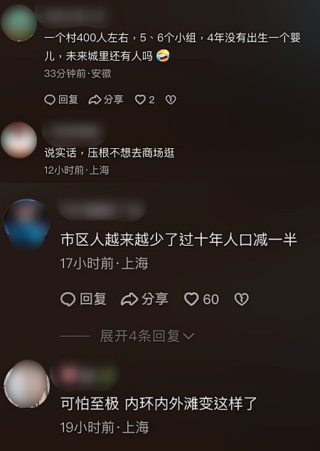 上海內環沒人了的現狀,引發網友熱議。有上海網友表示:「市區人越來越少了,過十年人口減一半。」