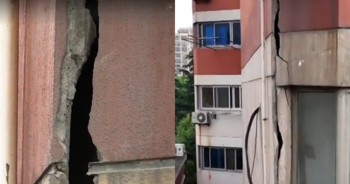 報導說,這條裂縫長約5米,從4層西南戶的陽台窗框下沿,一直延伸到了5樓西南戶的窗口位置。