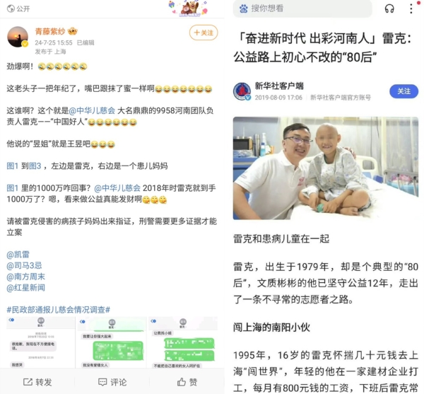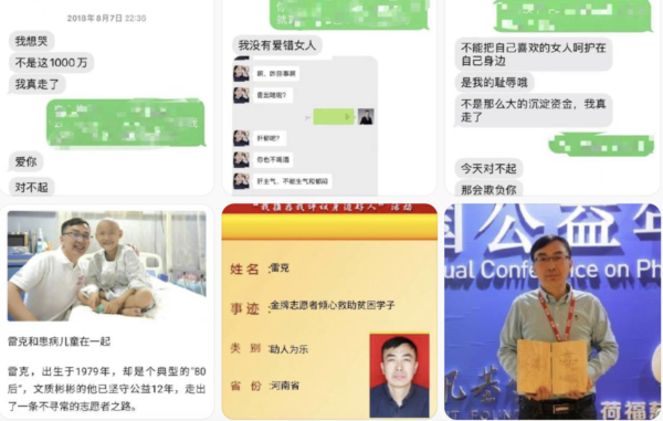 長期爆料大陸慈善機構黑幕的微博公益帳戶「青藤紫紗」留言稱:「雷克是啥?他可是當年被各主流媒體大肆吹捧的「中國好人」!但這位所謂的「中國好人」,「竟是個利用職務之便,經濟犯罪,侵占社會善款的高手!竟是個用給患兒的救命錢來威逼利誘患兒媽媽就範的高手!」