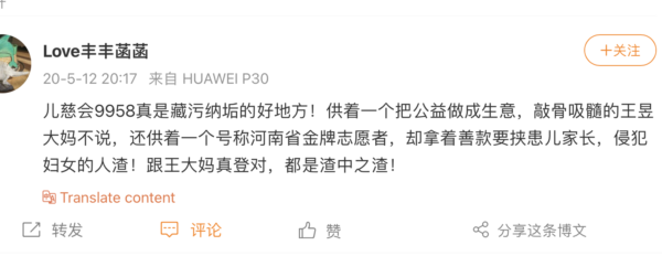 事實上, 微博紀錄顯示,早在2020年5月12日,就有網友發帖揭兒慈會9958藏污納垢,提到一個河南省金牌志願者,拿善款要脅患兒家長,侵犯女性,斥為「渣中之渣」。