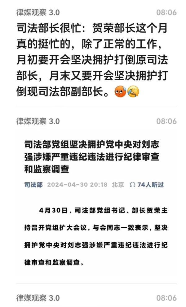 當天,中共司法部黨組書記、部長賀榮主持召開黨組擴大會議,宣稱「堅決擁護」劉志強被查。