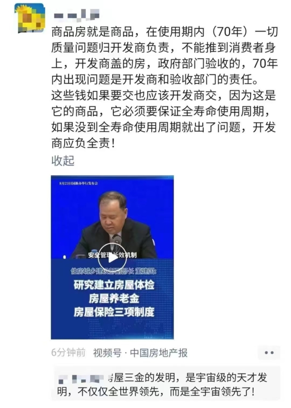 中共多家官媒引述「專家」説法稱,業主繳納的住宅專項維修資金已經跟不上「房屋維修成本逐年增加」的速度,並稱「房屋養老金」的資金來源將包括業主繳存、財政補貼、維修資金增值收益結餘等。其中業主繳存排在第一位。