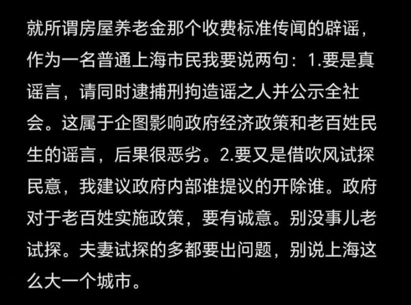 一名上海網民發帖指出,如果網傳上海收費標準真是謠言,就把造謠的人抓起來;如果是政府內部有人放風試探民意,就把這個人開除公職。