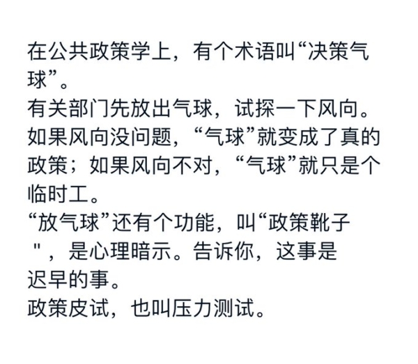 還有網民解讀,所謂的「謠言」其實就是當局放出來的「決策氣球」如果風向沒問題,「氣球」就變成政策;如果風向不對,「氣球」就只是個臨時工。