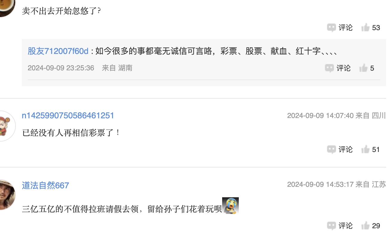 該公告引發網友一邊倒的質疑。有網友批評說:「賣不出去開始忽悠了?」、「又要平帳了是吧?」、「彩票滯銷下滑,這種消息越來越多了」、「如今很多的事都毫無誠信可言咯,彩票、股票、獻血、紅十字」、「行了行了,這個國家說啥我都不會再信了」。