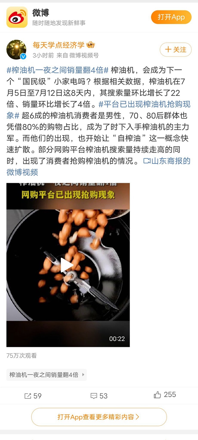 7月13日,「榨油機一夜之間銷量翻4倍」的話題,衝上中國百度和微博熱搜榜。