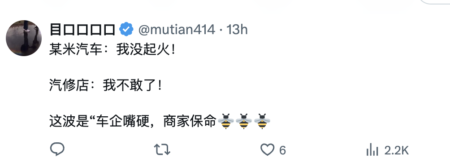 中國多地汽車維修店抵制小米汽車,在X平台上也引發網友熱議:「某米汽車:我沒起火!汽修店:我不敢了!這波是『車企嘴硬,商家保命』。」
