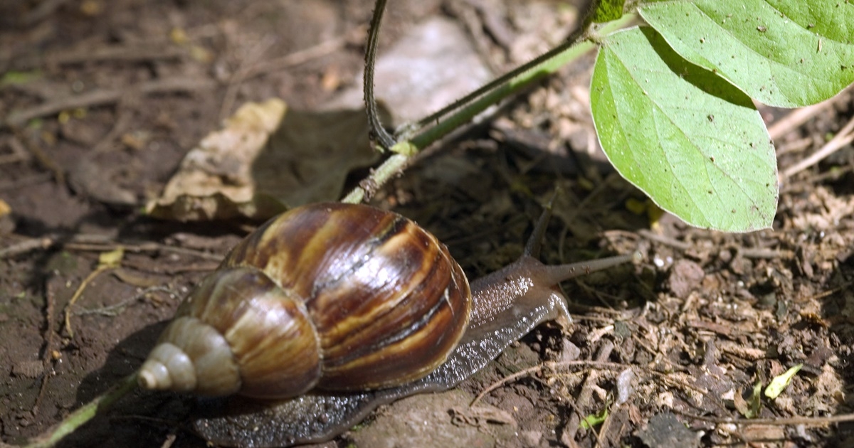 其實這不是普通蝸牛,這是褐雲瑪瑙螺,也叫「非洲大蝸牛」,屬外來入侵物種之一。這種大蝸牛平時喜歡躲藏在陰涼潮濕處、草木樹根下、潮濕的牆壁、陰溝等落葉腐爛的地方。
