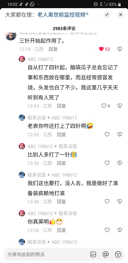 「自從打了四針,腦袋瓜子總會忘記事和東西放在哪兒,經常感冒發燒,頭髮也白了不少。我這裡幾乎天天聽到有人死了。」