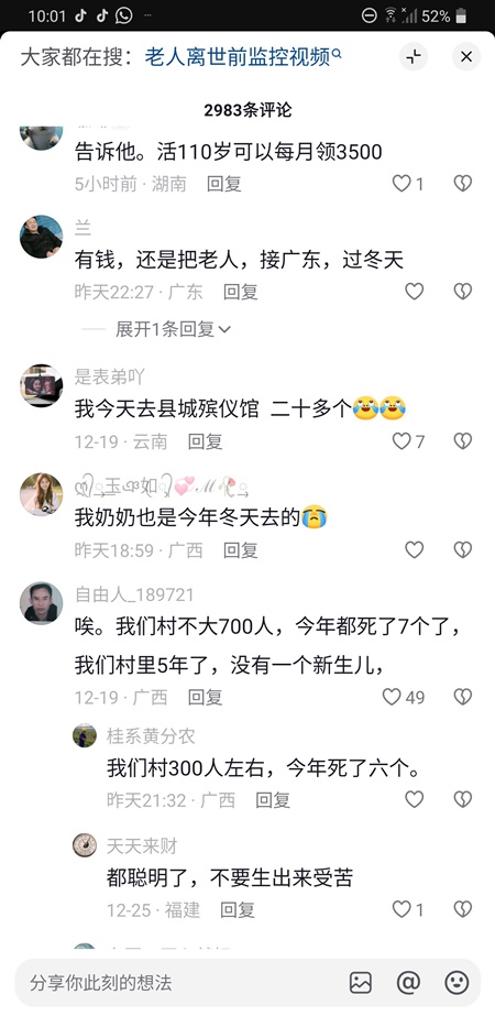 ????墙内消息:老人一个接一个地去世,网友留言:不止是老人,80、90后很多年轻人也纷纷去世