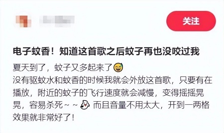 廣州的何女士日前發貼文稱,親測「滅蚊神曲」有效。她表示,下午在網上刷到「滅蚊神曲」能讓蚊子神魂顛倒,飛行變緩,容易被消滅。結果晚上睡覺凌晨4點被蚊子的嗡嗡聲吵醒,於是她拿出手機播放滅蚊神曲《Scary Monsters And Nice Sprites》。
