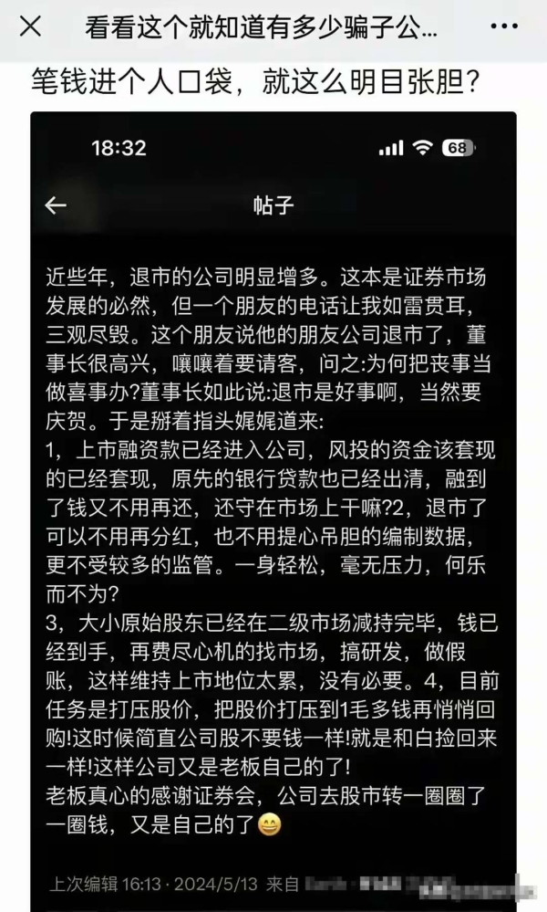 近日網上熱傳一篇貼文,內容是一家公司完成退市後額手相慶,因為上市融資款已經進了公司,大小原始股東也已經減持完畢,退市時只要大力打壓股價,再用極低價格回購,這樣融資款就「和白撿回來一樣」。