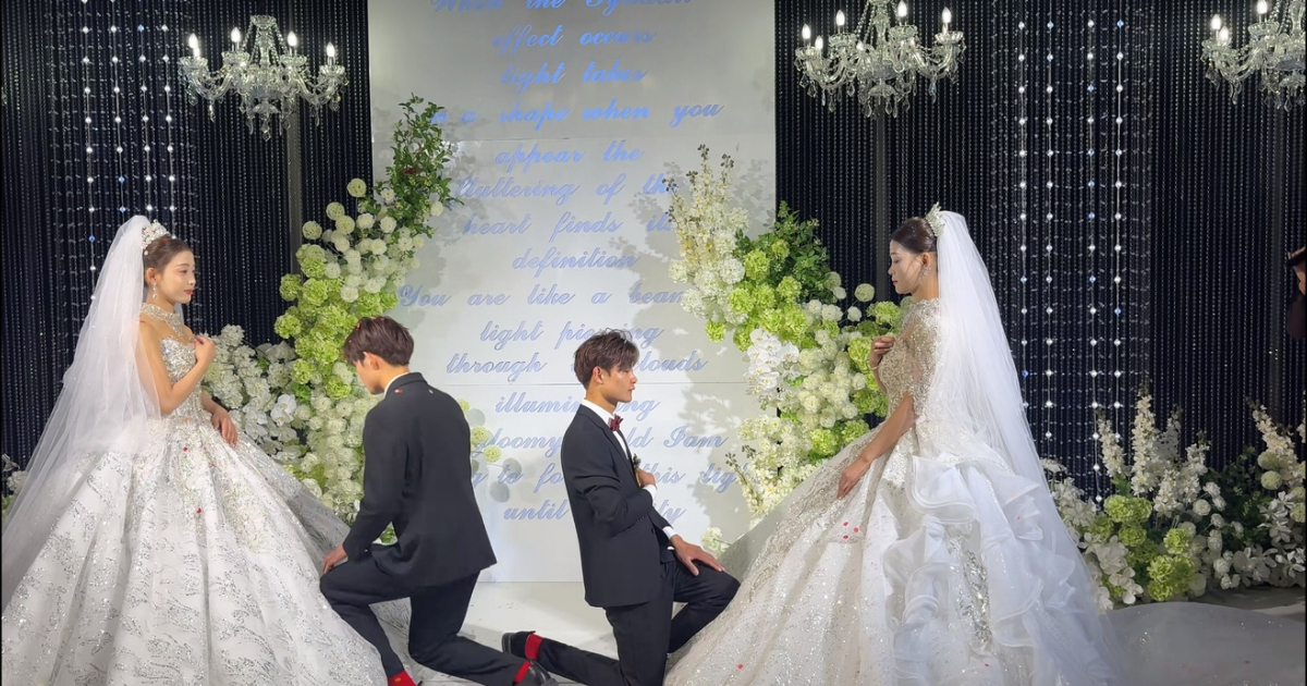 陸媒報導,11月28日,河南商丘一對雙胞胎兄弟同日迎娶雙胞胎姐妹。相關視頻在網絡熱傳。畫面顯示,兩場婚禮同步舉行,四位新人穿著相似的禮服,從現場布置到迎親流程,從新人著裝到親友站位,都高度相似。