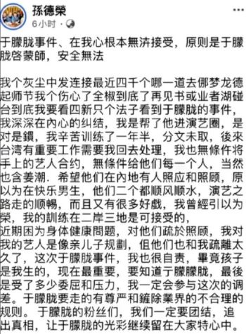 台灣著名經紀人孫德榮是幫助于朦朧從走出事業低谷並重新在演藝圈站穩腳跟的「伯樂」,與後者的情誼如師如父。于朦朧墜亡後,孫德榮在社交平台發布長文,直言于朦朧「像我親兒子」,並稱「我這孩子在人間過得辛苦,希望下輩子可以幸福快樂」,他強調「要知道于朦朧最後受了多少委屈和壓力」,他還呼籲于朦朧的粉絲們一定要團結,追出事件的真相。他更誓言,「我一定會參與這次調查,讓朦朧走得有尊嚴,並剷除業界不合理規則」。