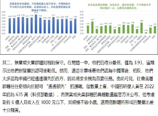 其次,無業或失業群體給觀點一的最低,這顯示他們大多認為中國已經「遙遙領先」於西方,因此將安全視為首要任務。