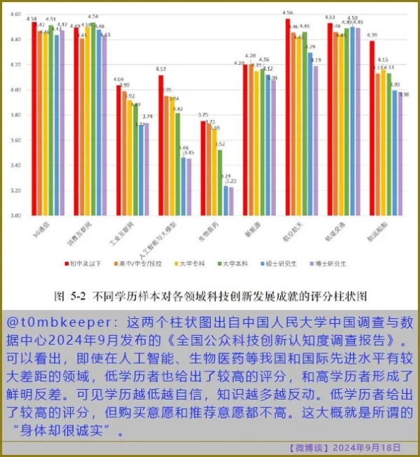 該報告提供的圖表顯示,在所謂「科技創新成就」方面,公眾工業互聯網、人工智能與大模型、生物醫藥這三個領域的認可度最低,總評分都低於4分,而且受訪者學歷越高,給出的評分越低。