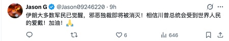 有網友表示:「伊朗大多數軍民已覺醒,邪惡獨裁即將被消滅!相信川普總統會受到世界人民的愛戴!加油!」