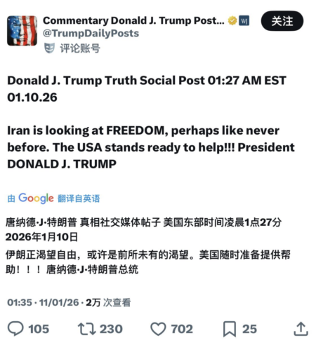 10日凌晨1點多鐘,針對伊朗日趨白熱化的局勢,川普在社交媒體上表示:「伊朗正展現出對『自由』的渴望,這或許是前所未有的。美國隨時準備提供協助!!!」