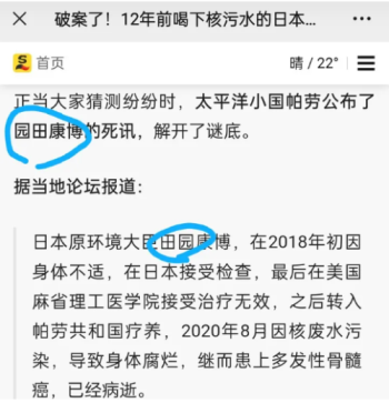 為證實東京電力福島第一核電站經淨化處理後排放的廢水安全,日本前政務次長園田康博曾於2011年10月當眾喝下一杯核處理水。時隔12年後,隨著福島核污水排海引發的輿論風波持續發酵,近日互聯網上突然開始瘋傳園田康博因罹患「多發性骨髓瘤」已於2020在帛琉死亡,且死前「全身腐爛」云云,甚至同時還配合發表了園田康博「病發」的發時序表,內容驚悚,賺足了眾網友的眼球。